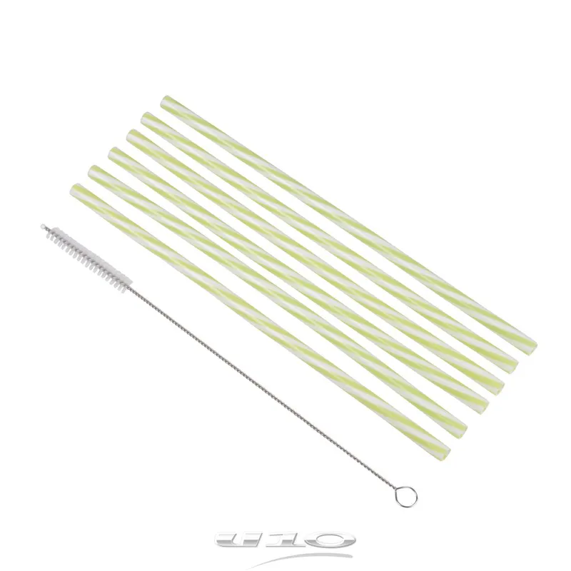 SET DE 6 PAILLES EN PLASTIQUE REUTILISABLE RAYURES TILLEUL / BLANC 23CM + BROSSE