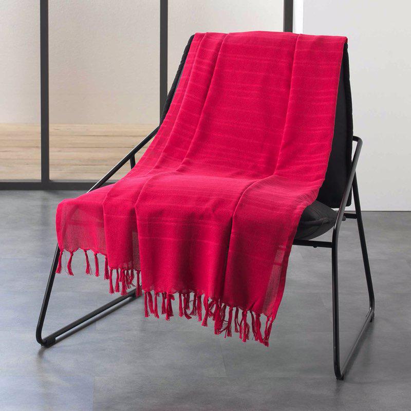 JETE DE FAUTEUIL A FRANGES 150 x 150 CM COTON TISSE LILIA FRAMBOISE