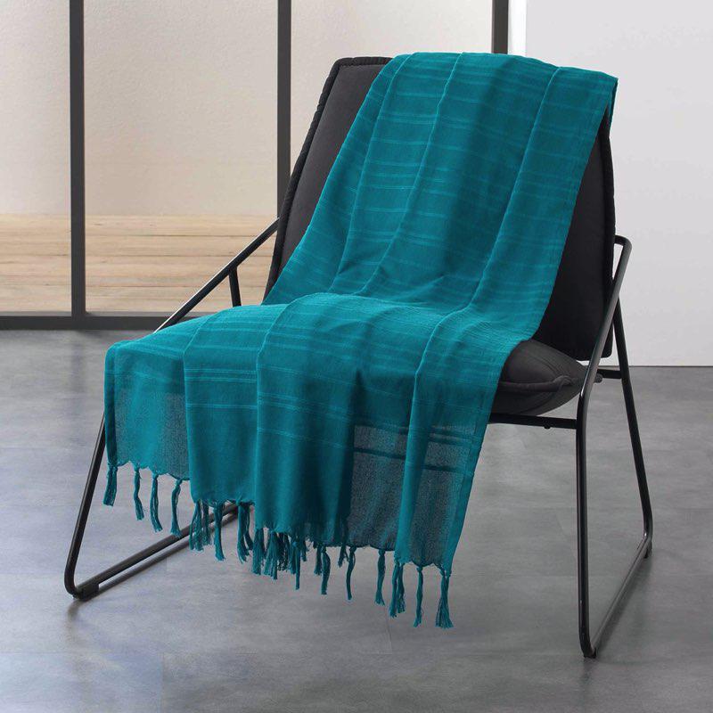 JETE DE CANAPE A FRANGES 220 x 240 CM COTON TISSE LILIA BLEU