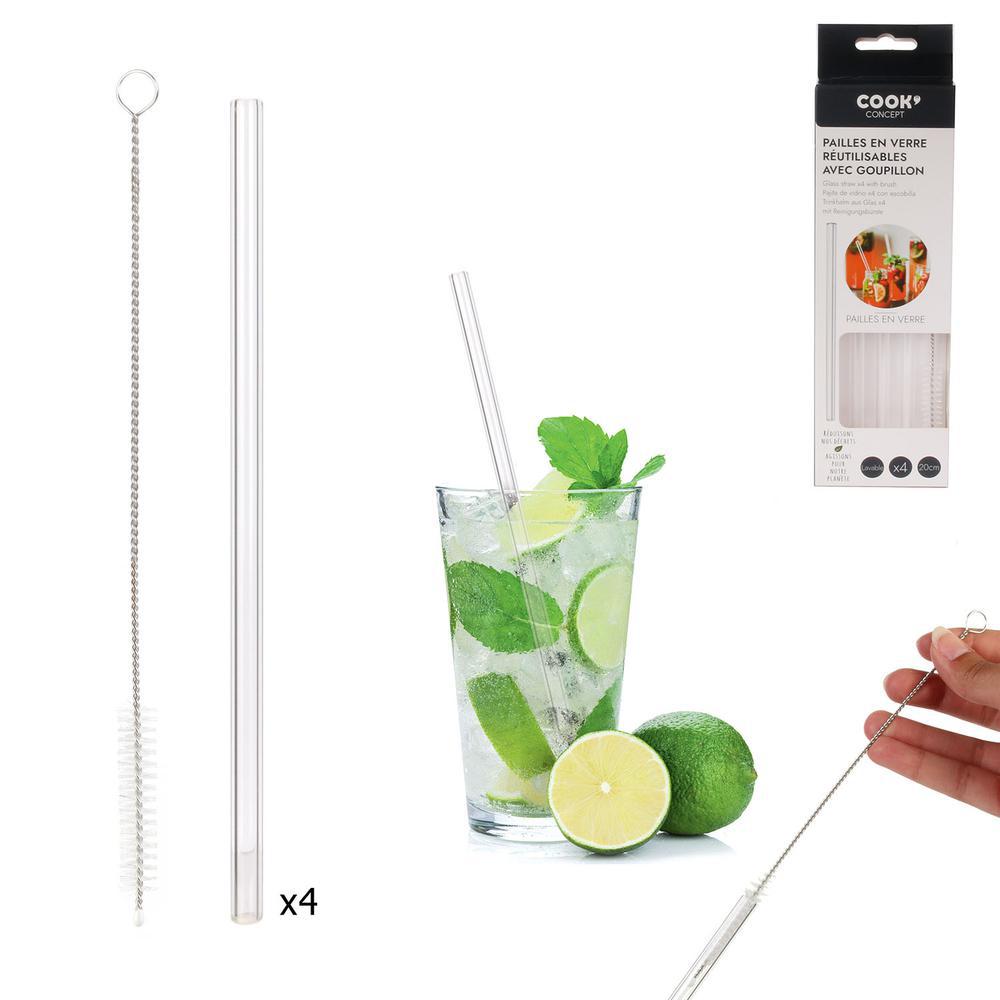 PAILLE TRANSPARENTE EN VERRE X4 AVEC GOUPILLON